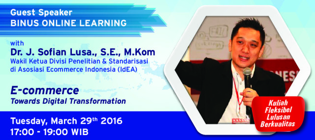 Mengangkat tema “E-commerce Toward Digital Transformation” berlangsung pada pukul 17.00 – 19.00 WIB pada tanggal 29 Maret 2016 ini diharapkan dapat memberikan insight kepada mahasiswanya langsung dari praktisi yang sudah berpengalaman dalam dunia profesional yang nantinya mampu mereka implementasikan di dunia kerja.