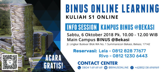 Hadiri Info Session Binus Online Learning untuk mengetahui detail perkuliahan online dan informasi mengenai beasiswa. Sabtu, 28 Juli 2018 pukul 10.00 – 12.00 @ Kampus Binus Bekasi