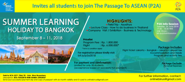 SUMMER LEARNING HOLIDAY TO BANGKOK-P2A INFO SESSIONShare toSUMMER LEARNING HOLIDAY TO BANGKOK-P2A INFO SESSIONShare toShare toRelated Posts You Might LikeSUMMER HOLIDAY LEARNING TO BANGKOK5 Juli 2018Invite all students to join The Passage To ASEAN (P2A) – SUMMER LEARNING HOLIDAY TO BANGKOK September 8 – 11, 2018 Highlights : – Fi...Info Session P2A17 Juni 2019Seminar & Info Session S1 Online Learning19 April 2018