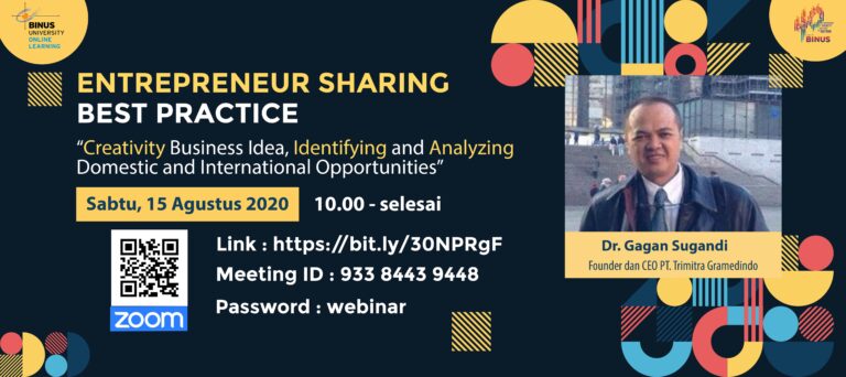 Entrepreneurship Sharing Best Practice13 Agustus 2020Creativity Business Idea, Identifying, and Analyzing Domestic and International Opportunities with Dr. Gagan Sugandi (Founder & CEO PT. Trimitra G...
