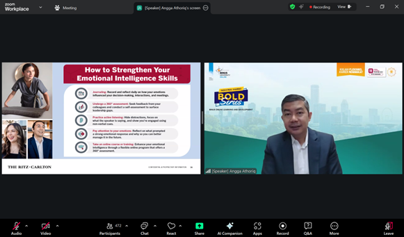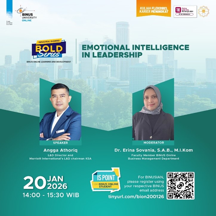 To strengthen EI, Mr. Angga offers practical tips such as journaling to reflect on emotional responses, undergoing 360° feedback for self-assessment, practicing active listening, and pursuing further training through workshops or online courses. These strategies will empower students to enhance their emotional intelligence, equipping them with the skills needed to lead effectively in their future careers. Finally, the Q&A session will offer an opportunity for students to engage directly with Mr. Angga, allowing for personalized insights and deeper discussions on applying EI in real-world leadership roles. Through this webinar, students will gain a comprehensive understanding of Emotional Intelligence, learning how to use it to become more effective and empathetic leaders in their careers.