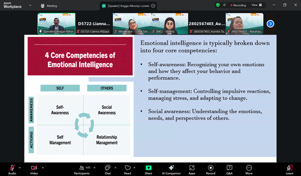 The webinar about Emotional Intelligence, emphasizing its importance in recognizing and managing one’s emotions, as well as understanding and influencing others’ emotions. Students will learn that EI is a dynamic skill that continuously evolves, underscoring the need for ongoing development in their careers. Mr. Angga will then focus on the role of EI in leadership, demonstrating how it helps leaders inspire teams, manage challenges, and foster a collaborative environment. By combining technical skills with emotional awareness, leaders can make better decisions and enhance communication within teams.