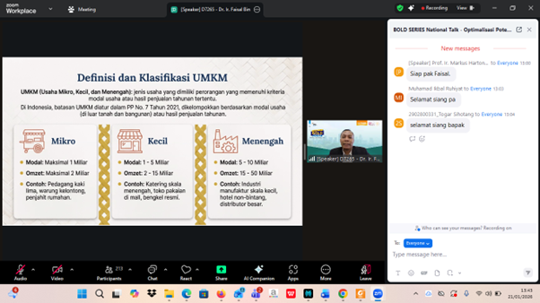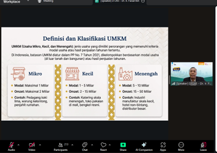 Setelah pemaparan materi, sesi dilanjutkan dengan diskusi dan tanya jawab yang berlangsung secara interaktif. Moderator membuka ruang dialog dengan mengundang pertanyaan dari peserta melalui chat box maupun fitur raise hand. Antusiasme peserta mencerminkan tingginya minat terhadap topik AI dan Big Data sebagai solusi praktis dan strategis bagi tantangan yang dihadapi UMKM saat ini.