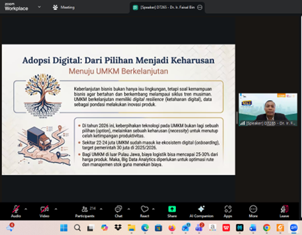 Dr. Faisal juga menekankan bahwa integrasi AI dan Big Data Analytics tidak selalu identik dengan investasi teknologi yang mahal dan kompleks. Dengan pemilihan alat digital yang tepat, pemanfaatan platform teknologi yang sudah tersedia, serta pengelolaan data yang sederhana namun terstruktur, UMKM tetap dapat mengadopsi teknologi ini secara realistis, bertahap, dan sesuai dengan kapasitas sumber daya yang dimiliki. Transformasi digital yang dirancang secara tepat diyakini mampu mendukung pertumbuhan UMKM yang berkelanjutan, tidak hanya dari aspek ekonomi, tetapi juga dari dimensi sosial dan lingkungan.