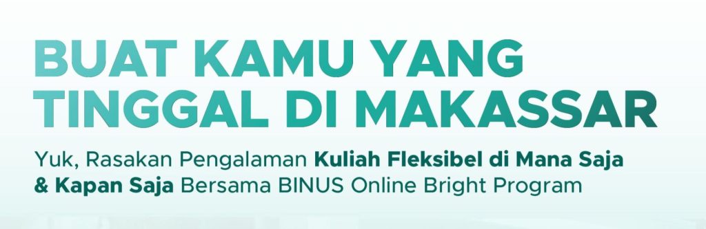 BINUS ONLINE BRIGHT adalah Program Khusus untuk Fresh Graduate SMK/SMA yang berdomisili di Makassar. Melalui program ini, mahasiswa dapat mengikuti perkuliahan secara online dan tutorial secara onsite di BINUS Learning Community (1 tahun pertama perkuliahan).